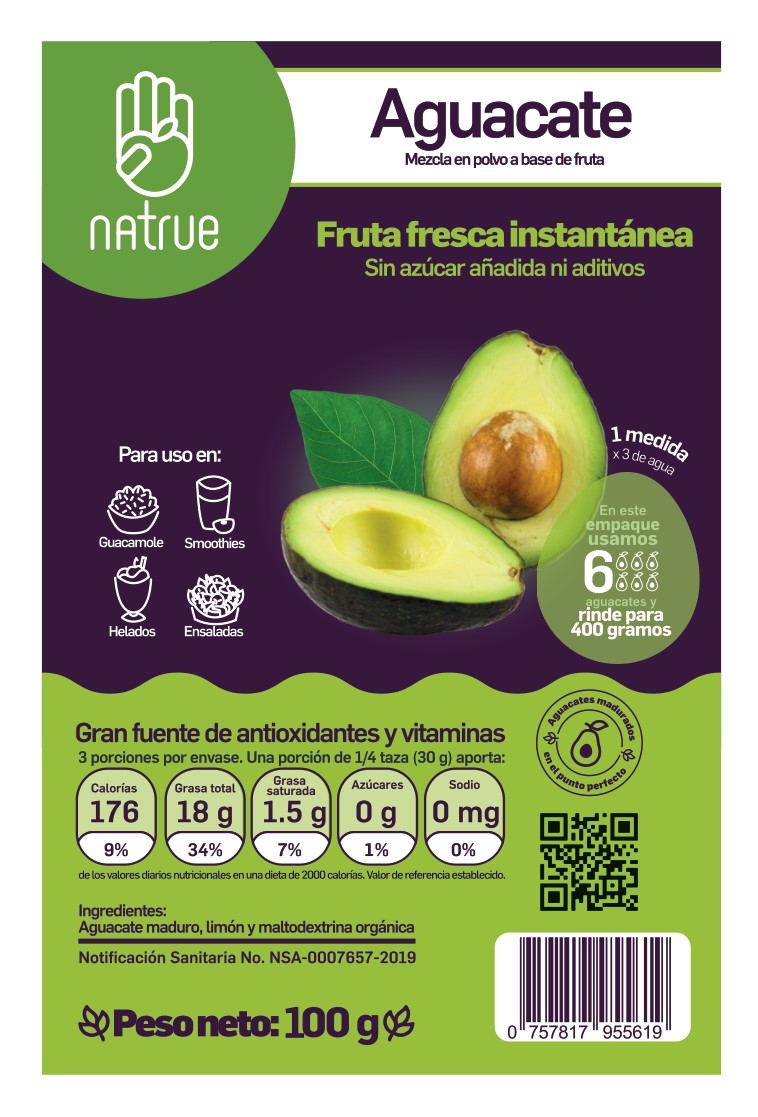 Polvo de pulpa de aguacate 100% natural, práctico y funcional que conserva las propiedades organolépticas y nutricionales características de la fruta fresca. Puedes usar Natrue Aguacate para preparar batidos, confitería, bebidas saborizadas, jugos, y mucho más.