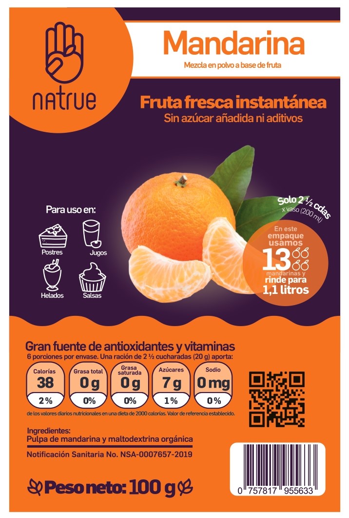 Polvo de pulpa de mandarina 100% natural, práctico y funcional que conserva las propiedades organolépticas y nutricionales características de la fruta fresca. Puedes usar Natrue Mandarina para preparar batidos, confitería, bebidas saborizadas, jugos, y mucho más.